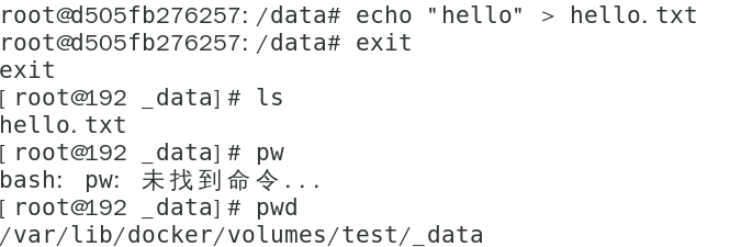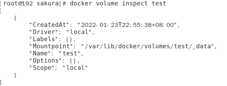 可以看到,Mountpoint值为/var/lib/docker/volumes/test/_data,说明改卷会将选定的容器目录映射进主机的该目录中。如果想要让容器使用该卷,使用run -v test:...来绑定该卷即可。