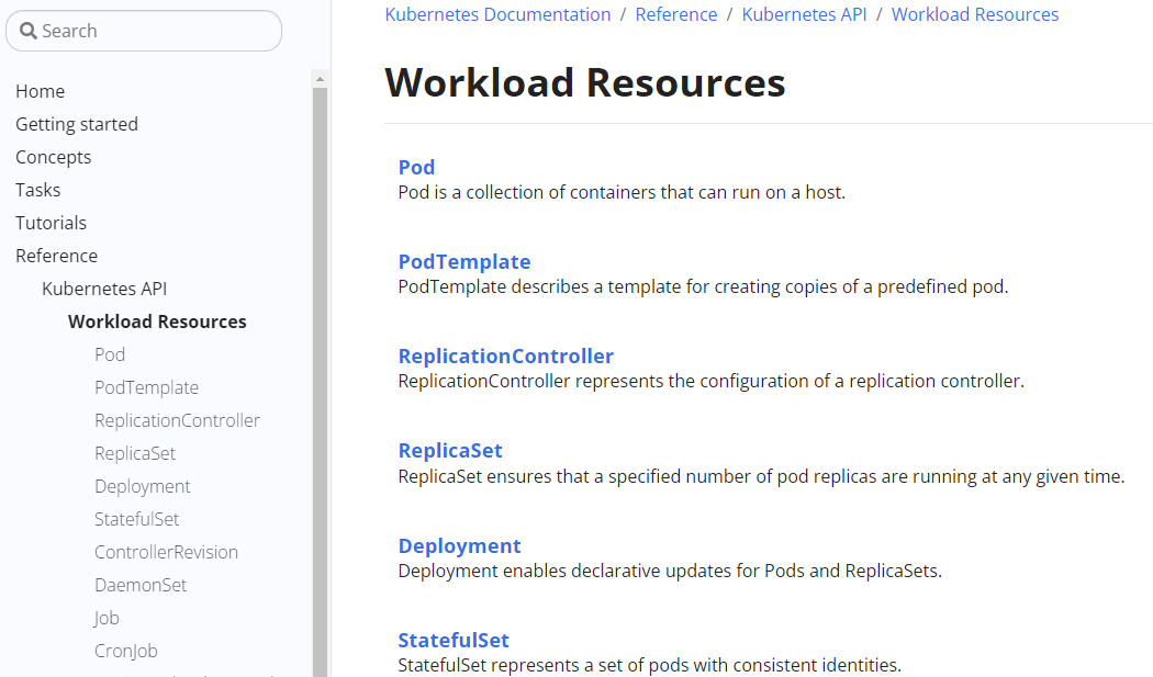 那么,我们该如何知道诸如Pod、Deployment这些API对象的资源清单该怎么写呢?有哪些字段需要指定,该怎么指定呢?答案就是官网 => Workload Resources。诸如Pod、ReplicaSet、Deployment这些都属于API对象的Workload Resources,官网会列出他们: