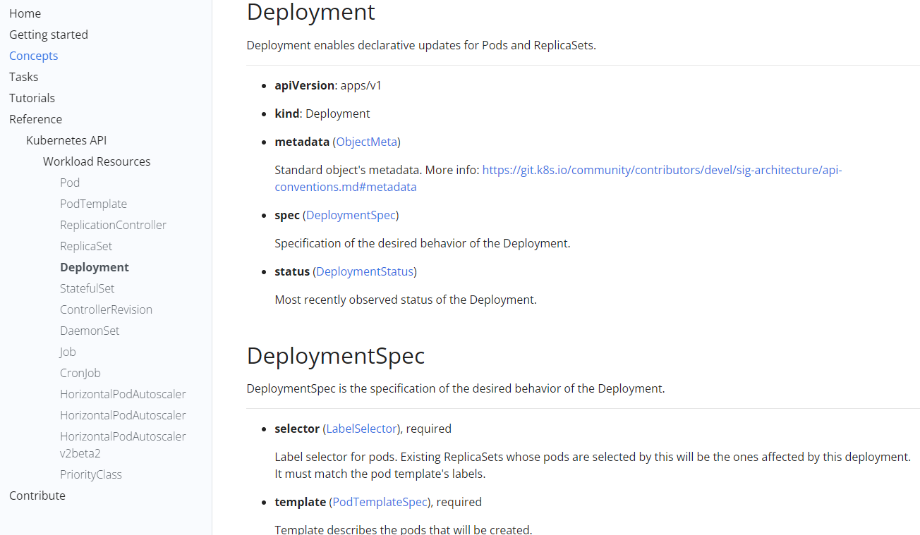 点进想看的对象中,即可看见每个字段的意义。比如点进Deployment,可以看到apiVersion、kind、metadata、spec、selector等等。注意,如果字段后面标注了requested,就说明该字段是必须的,不能少。