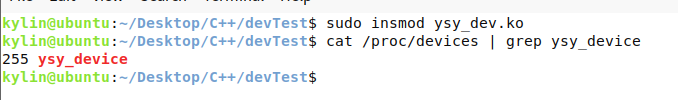 注意,模块是模块,设备是设备,设备只是借助模块来注册和卸载,所以设备名不等同于模块名,根据驱动代码可知,设备名为ysy_device。