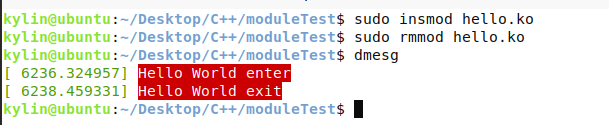 在工作目录下执行命令make,它会自动找到该上述Makefile进行执行。编译完成后即可安装/卸载该模块。使用insmod hello.ko来安装,使用rmmod hello.ko来卸载,结果如下,注意要sudo。