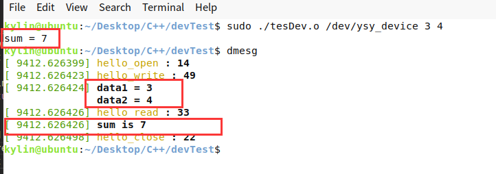 使命令sudo ./devTest.o /dev/ysy_deivce 3 4 来执行测试程序,打开设备驱动并计算3和4的和,并使用dmesg查看内核缓冲区,结果如下: