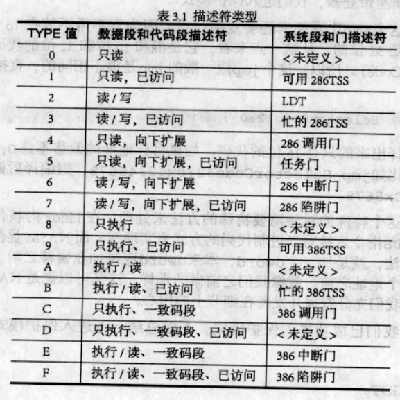 其中,当S=1时,TYPE<8对应数据段,>=8对应代码段;当S=0时,TYPE<8对应系统段,>=8对应门描述符。