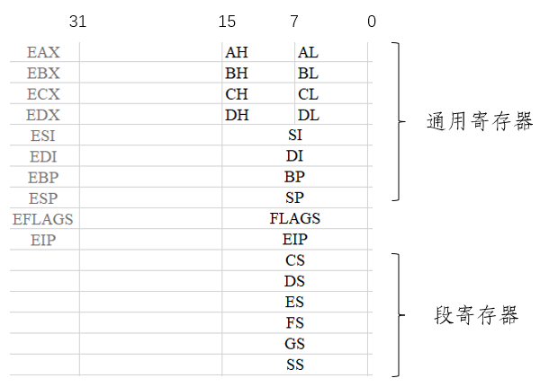 可以看到,通用寄存器、标志寄存器、指令指针寄存器都扩展到了32位,但是段寄存器没有,仍然只有32位,这是因为段寄存器16位就够用了,这个后面会解释到。