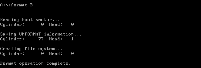 使用bochs -f bochsrc启动Bochs,待FreeDos启动完毕后格式化B盘: