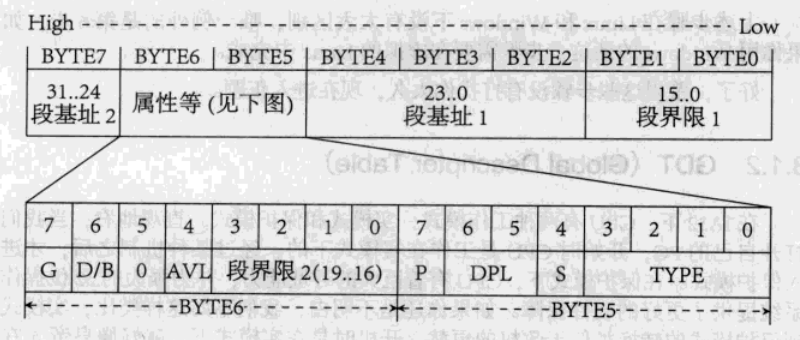 既然是表,那一定有表项,每一个表项就是一个段描述符,大小为8字节,用来描述一个内存段的段基址、段界限和段属性等等。注意,表项就是描述符,而不是描述符的索引。不过这里不会详细介绍,只浅谈一下即可,后面会专门开一篇博客专门介绍GDT和描述符。