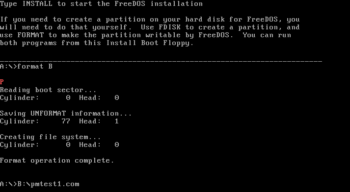 然后到FreeDos中,执行命令:B:\pmtest1.com,就运行起来了,如图所示,显示一个红色的p。