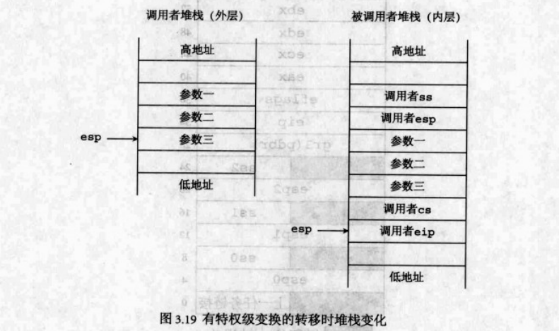 对于第1种,当处理器要从低向高跳转时,会提前将目标栈记录在某个地方,当实行跳转时再从中取出来加载到SS和ESP中以转换栈,TSS中的3对栈字段就是那个用来存放的地方。由于除了返回指令,处理器只能由低到高跳转,所以TSS中所记录的栈是转移后的高特权级目标栈,所以它一定要比当前特权级要高。这样就明白了,TSS中不会记录第3特权级的栈,因为没有更低特权级向它转移。